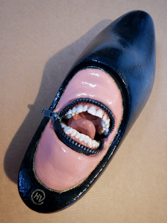 Blauwe houten klomp met gips gebit en klei.